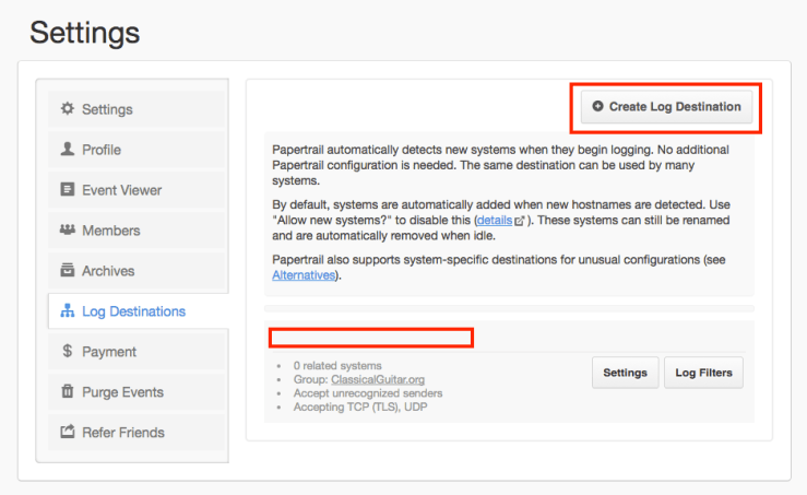 A log destination is what Papertrail calls a host + port listener that can receive remote syslog messages. Papertrail sets up a single log destination per account by default.