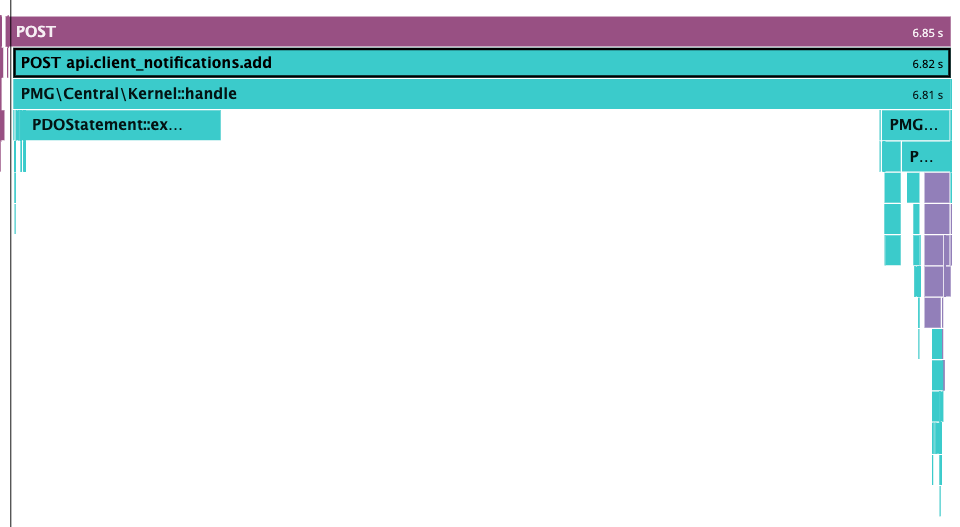 There is a pretty slow query (2 seconds in the example above) to the left, then a large gap during which deserialization and validation occurs, then the rest of the work.
