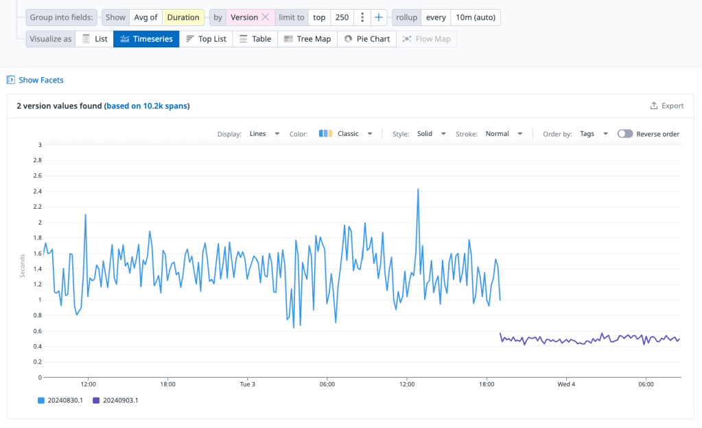 This is all fine on the pre-prod environment and in tests because the data set was so much smaller. And frankly it was probably fine on production but got steadily worse as the data set grew. A small change to that validation logic later and the endpoint is behaving much better on average.